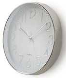Deze opvallende wandklok van Nedis heeft zilveren cijfers als uuraanduiding en zilveren wijzers. De klok heeft een witte wijzerplaat en een zilveren rand. De diameter is 30 cm, wat een standaard formaat is. De klok tikt op een AA batterijtje en en om de kwaliteit te garanderen ontvangt u twee jaar garantie.
