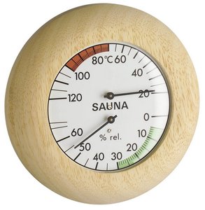 Duidelijke saunathermometer van hout met een bereik van 20 tot 120 graden. Naast de temperatuur geeft de thermometer ook de luchtvochtigheid weer. Beide meters zitten in een houten frame.