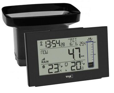 Compleet TFA weerstation met regenmeter die een bereik heeft van 60 meter in open veld. Verder heeft het weerstation een radiogestuurde klok, datum- en weekdagweergave, binnen- en buitentemperatuurweergave en laat het neerslaggegevens met geschiedenis zien. Met een compact formaat van 150 x 96 x 44 mm past het gemakkelijk in elke ruimte en dankzij de elegante zwarte kleurstelling misttaat hij nergens. Het weerstation werkt op 2x AA batterijen (niet inbegrepen) en wordt geleverd met een buitenregenmeter die ook op 2x AA batterijen werkt. De garantieperiode bedraagt 2 jaar.